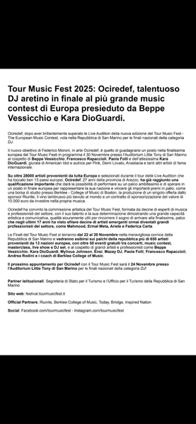 Finalista nazionale al Tour Music Fest, un traguardo che rappresenta il mio percorso artistico e la costante ricerca di qualità.